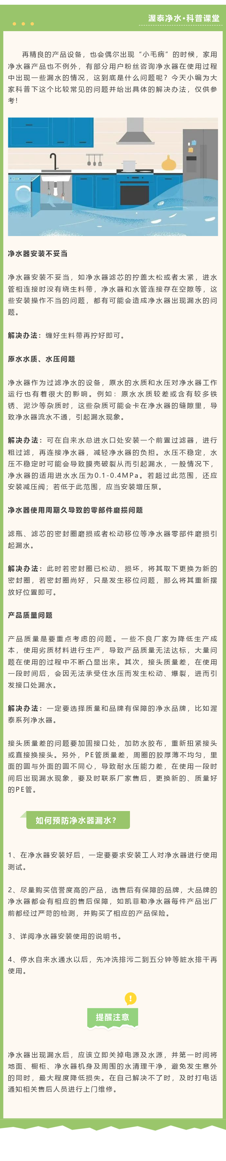 【概要描述】再精良的产品设备,也会偶尔出现“小毛病”的时候,家用净水器产品也不例外,有部分用户粉丝咨询净水器在使用过程中出现一些漏水的情况,这到底是什么问题呢?