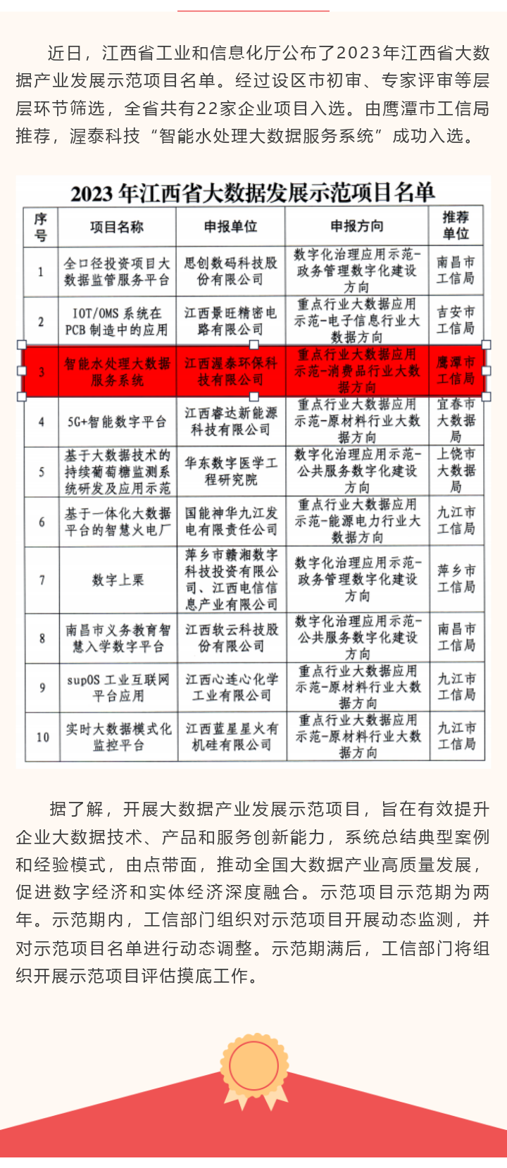 【概要描述】近日,江西省工业和信息化厅公布了2023年江西省大数据产业发展示范项目名单。由鹰潭市工信局推荐,渥泰科技“智能水处理大数据服务系统”成功入选...