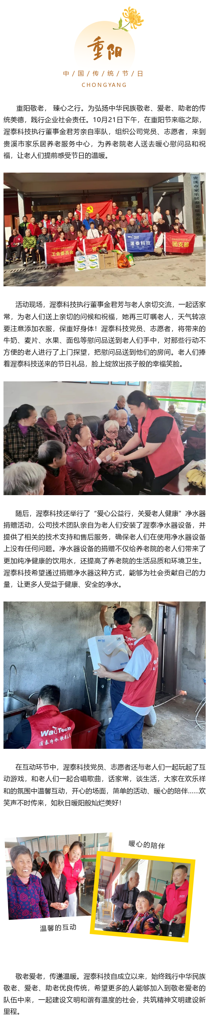 【概要描述】10月21日下午,在重阳节来临之际,渥泰科技执行董事金君芳亲自率队,组织公司党员、志愿者,来到贵溪市家乐居养老服务中心,为养老院老人送去暖心慰问品和祝福,让老人们提前感受节日的温暖...