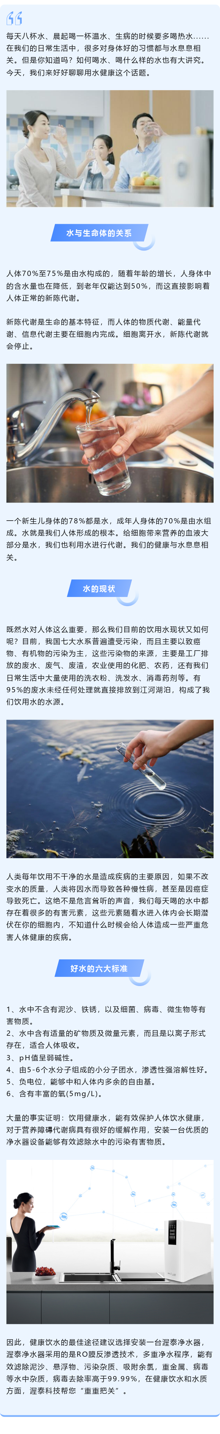 【概要描述】.在我们的日常生活中,许多对身体好的习惯都与水息息相关。但是你知道吗?如何喝水、喝什么样的水也有大讲究。今天,我们来好好聊聊用水健康这个话题...
