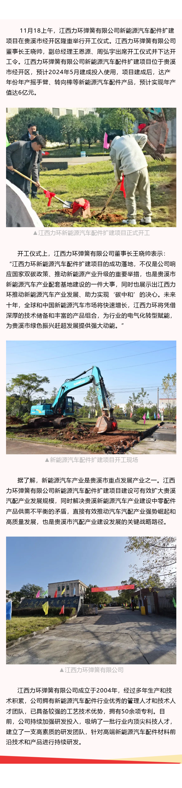 【概要描述】 11月18上午,江西力环弹簧有限公司新能源汽车配件扩建项目在贵溪市经开区隆重举行开工仪式...